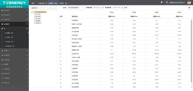 能耗分析包括企業(yè)用能分析、部門綜合能耗、設備用能分析和電量指標綜合分析這四類,將企業(yè)中各部門及各監(jiān)測點實際用能情況,通過不同的分析方式展現出來。
