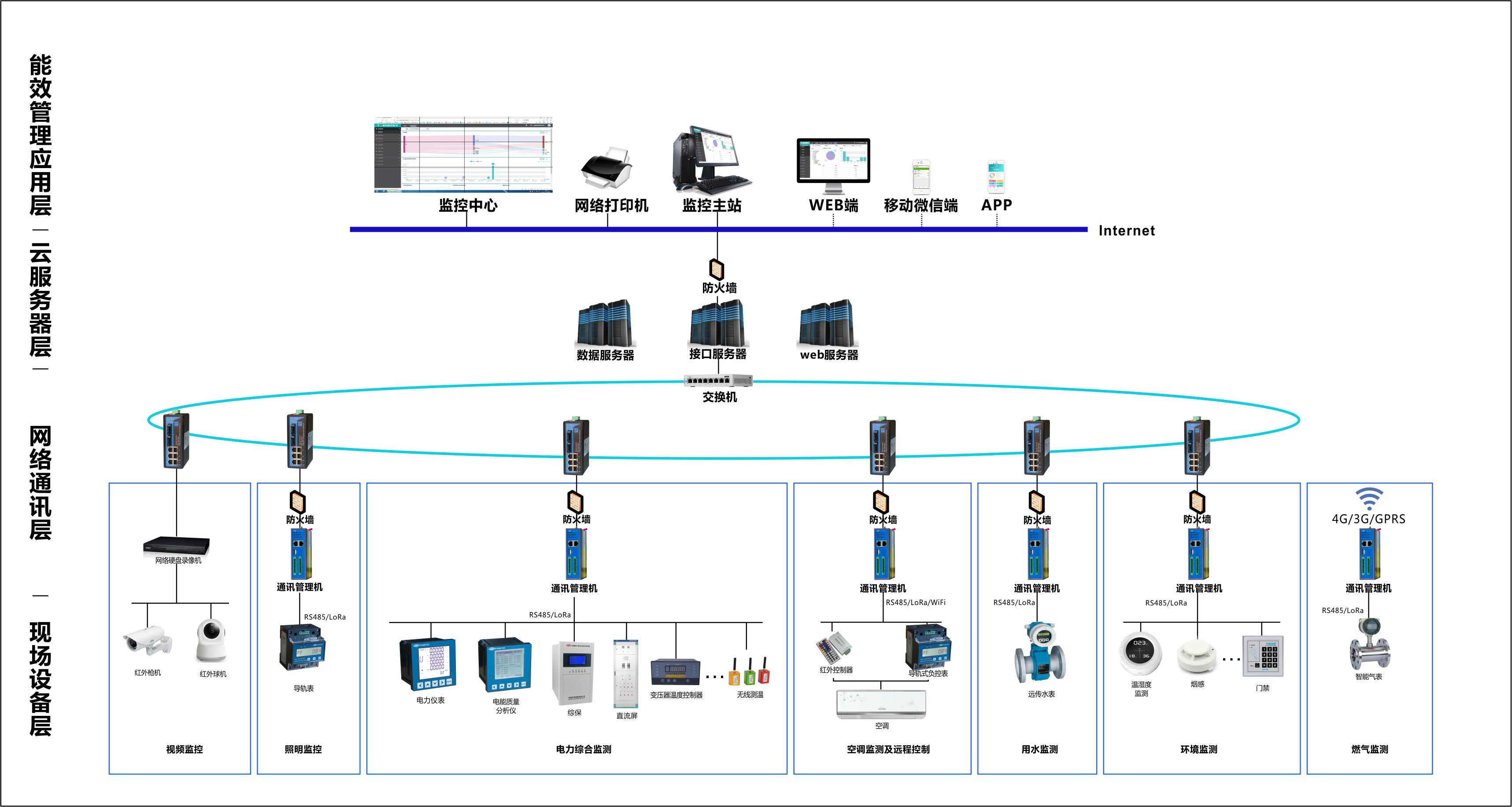 現(xiàn)場采用RS485、以太網(wǎng)GPRS、4G、NB-ot.lora、 Zigbeeifi等傳輸方式,將區(qū)域內(nèi)的電力采集模塊連接至相應(yīng)的通訊管理機;各通訊管理機通過用戶局域網(wǎng)連接至中央服務(wù)器。