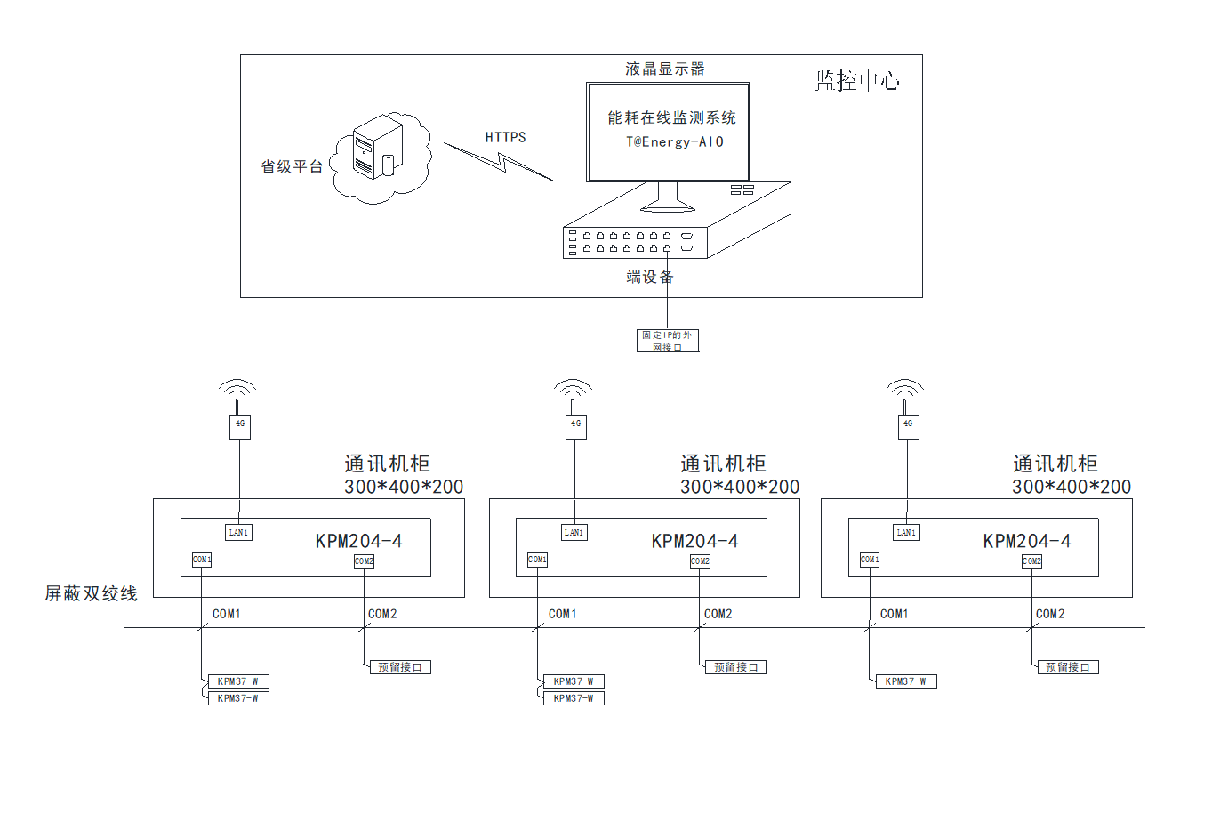 端設(shè)備安裝在企業(yè)配置中心,需要有可用的外網(wǎng)和內(nèi)網(wǎng)接口,由于通訊管理機(jī)使用4G的方式傳輸數(shù)據(jù),因此端設(shè)備安裝位置比較靈活。